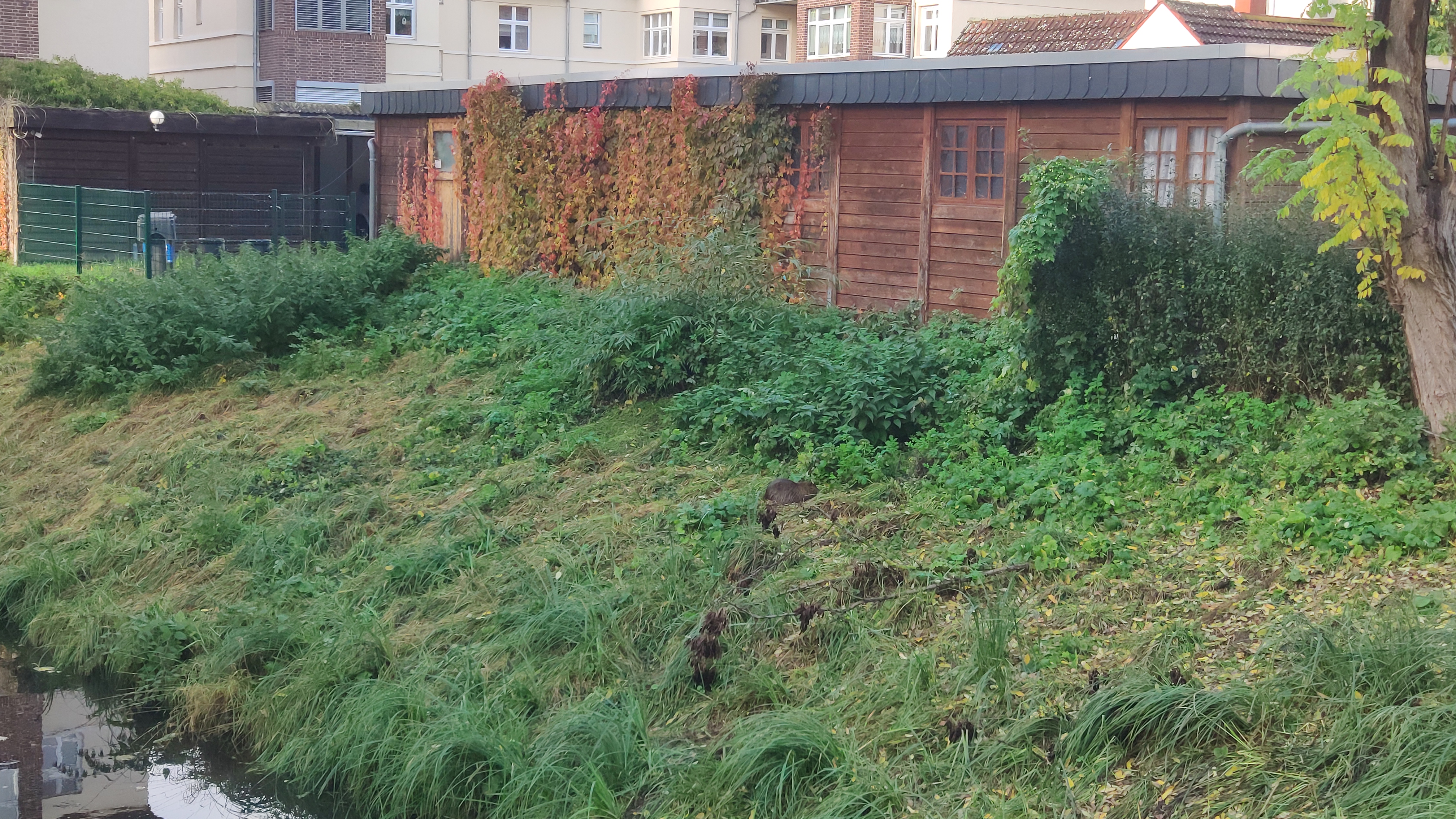 这条小溪有鸳鸯,我便停了下来。后来发现草地里有只类似老鼠的动物在吃东西,一开始吓了我一跳。后来看到水里又游来了一两只小的,我确定这不是老鼠。因为它们的胡子很长,个子也比老鼠大,还会游泳。但是因为太远了,我手机倍数放到最大也照不清楚它们的样子。我看了好一会儿它们,就趴在桥的栏杆上。那时候还出了一阵太阳,光线好极了。