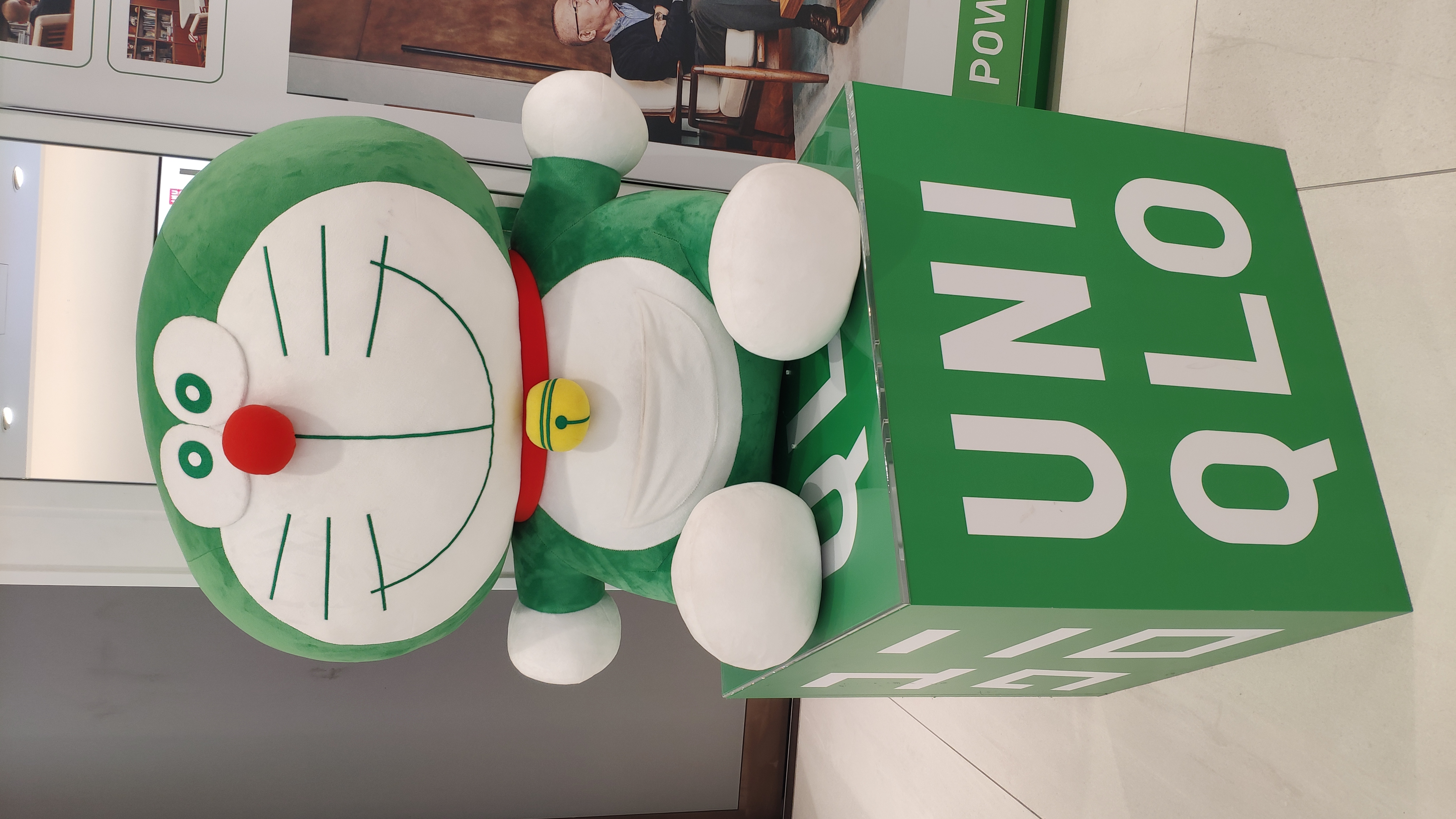 Y 网购了一件优衣库,想在实体店退货,再拿新的快递件。但是店员说网上买的只能网上退,或者在店里按实时售价换别的。她如果想换尺码,得补钱。我们就走了。之所以拍哆啦 A 梦,是因为第一次见。