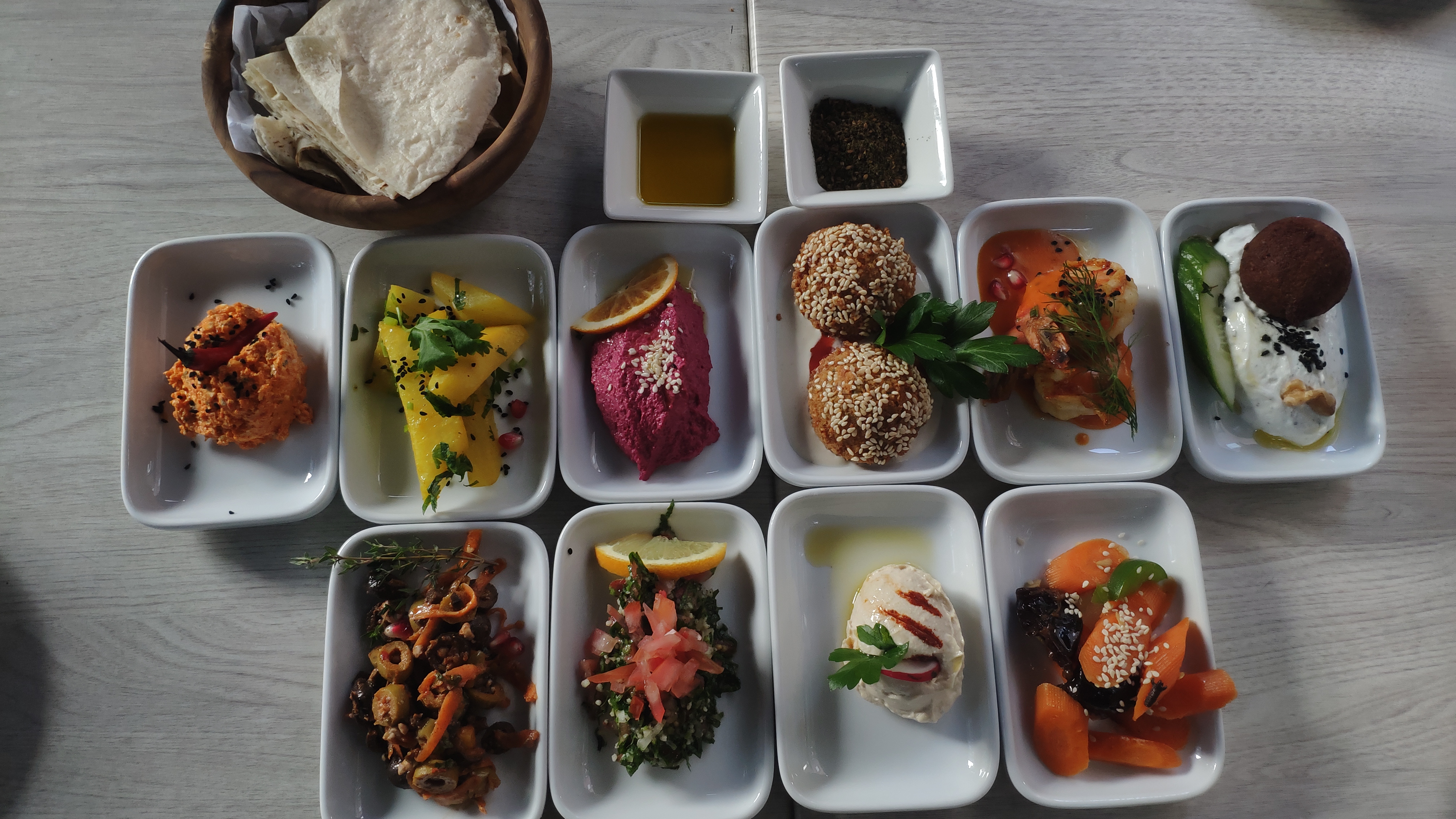 晚上 C 就带我们去吃了黎巴嫩菜。老实说,我不是很喜欢。C 和我们说了一下这家店和菜的历史,不过我基本忘了。但是有个服务员特别热情,知道我们是中国人还拿纸笔过来,让我们把他家里人的中国名字写下来,他拿去纹身。当然了,他们都在说德语,所以我全程耳聋。