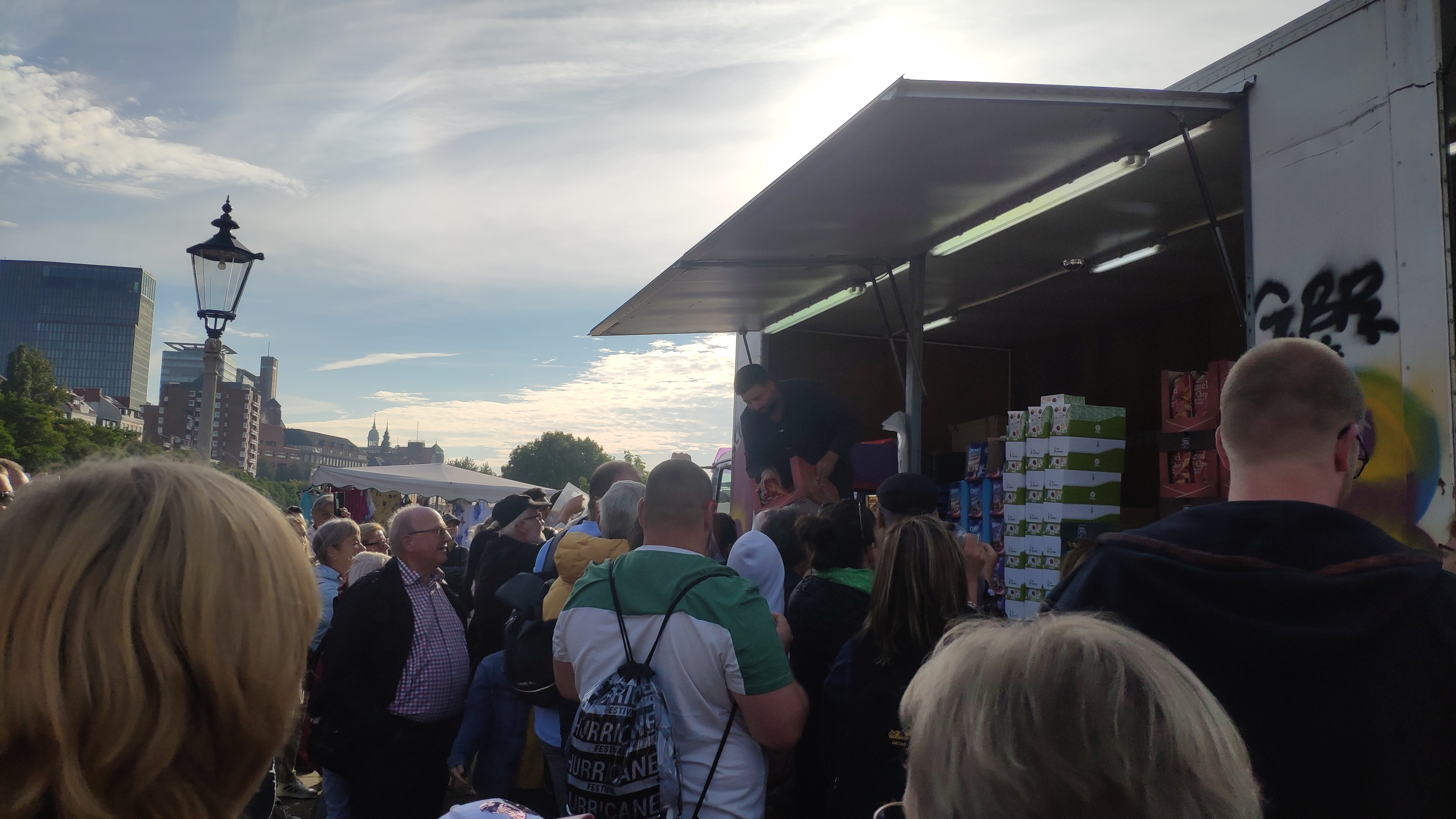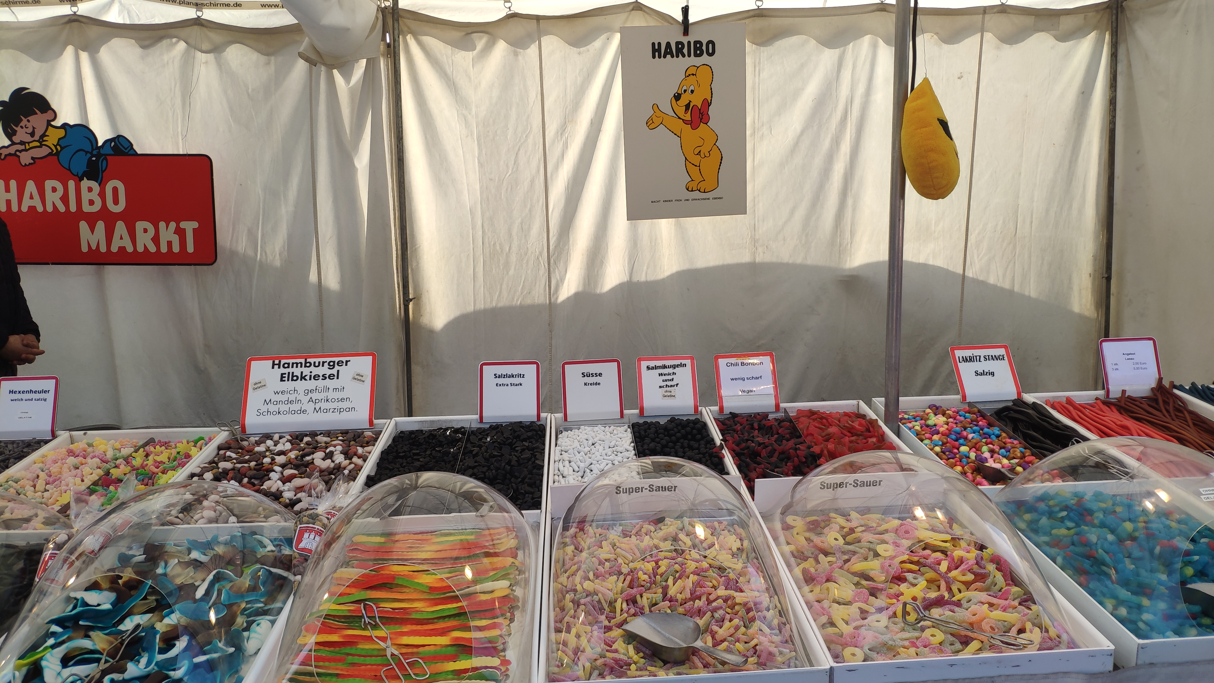 这里卖果蔬的感觉都是土耳其人,德国人不多,主要卖水产类。很多衣服摊档让我一秒回到中国乡下市集,五颜六色,花花绿绿,色彩缤纷。有几个大货车柜在卖水果和零食,他们现场叫喊,现场装货,有点主播带货的意思。不过做这个得看人,有个卖水果的大叔就很放得开,所以周围的人听了也开心。但是上图这个大叔就很放不开,自己比观众更尴尬。大概是零食都不重,他车子也小,所以顾客就自己举着袋子,等老板把零食放进去。现场看着十分像朝圣,等着主的恩赐。