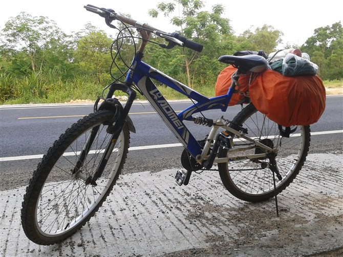 我去骑行也是意外的事。三月的时候我准备绕着沿海搭车北上,结果刚到厦门,诺基亚黑白手机就坏了,只好直返。我想起我在厦门搭讪认识的一个姑娘刚好在广州,就找她聊了一下。她说她准备去海南骑行,网上找人借车。我想着还可以这样,那我也试试吧。她因为有骑行经验,所以最后一个圈子里的人把山地车借给了她。而我不认识人,最后是一个海口的男生把废置的普通单车借给了我。那辆车很重,还需要修一下才能上路。我当时觉得我还年轻,有车就行。毕竟自己去车行租车得好几百呢,那时候我身上总共就几百块钱。