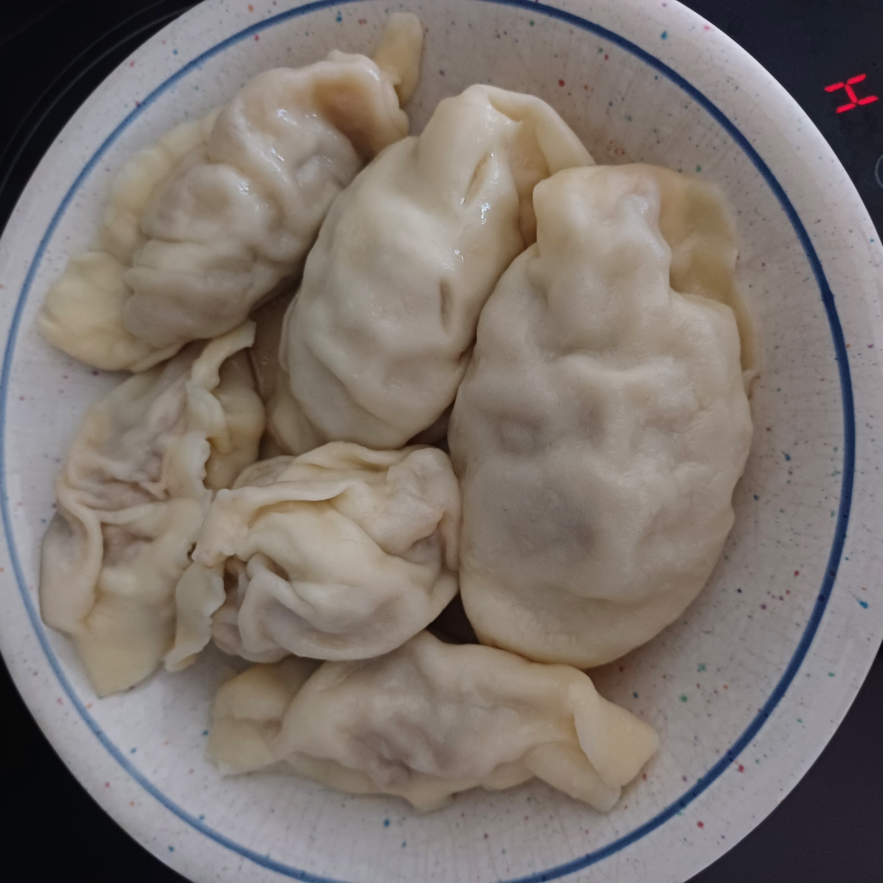 跟着小高姐做羊肉饺子的视频,一步一步走。但是我败在了擀面皮那步。我没有擀面杖,学的是其他视频的方法,先是分小剂子,摁扁,如此重复,最后把四个叠一起,用勺子压(图一)。结果,最后四个饺子皮变成的一团。无奈,我只好把它们分开,再每个用玻璃瓶压。但是剂子太大了,压出来的饼包一个太大,两个太小。我懒得改,于是最开始的几个饺子,差不多我拳头大。因为太饿了,我还只是包了几个就迫不及待煮来吃了。煮熟后,完全骨肉分离,有的还破了皮(图二)。