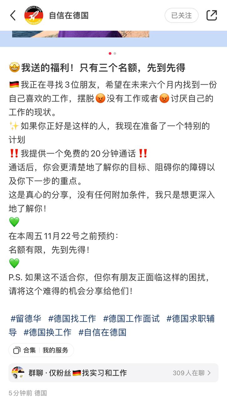 起因是:上周五,我通过网友的朋友进了一个电报群,群里都是在德国从事计算机行业的中国人。拉我进去的人说现在好像很少聊工作,主要聊天。我想,有一个渠道算一个吧。立马在群里说了自己的情况,并希望大家帮忙内推或者给点建议。